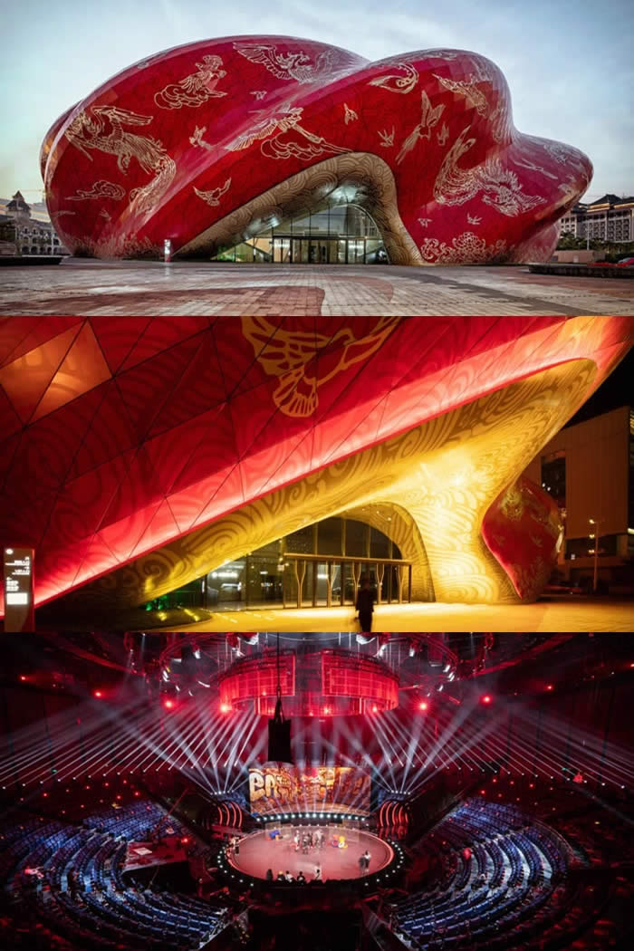 The theatre is wrapped in undulating red cladding made from triangular panels, which was designed to recall the folds in flowing silk. “We have drawn inspiration from traditional and contemporary arts commonly practised in the region. Silk cloth has been made, painted, and embroidered in the city since the Han Dynasty,” explained Chilton. “We drew from the physicality of the material in our approach to the form through a series of gently twisting folds that define the outer envelope.”