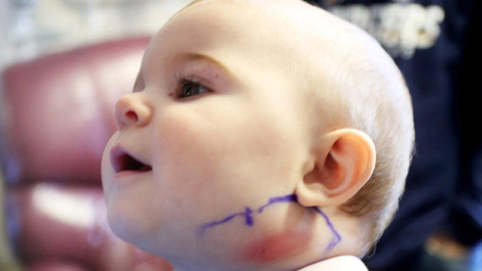 The doctors believed it was a swollen gland and sent the baby home after breaking a pimple and drawing marks on her face to monitor the swelling.
