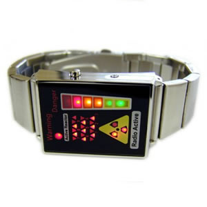The time in this Radio Active wrist watch is displayed by simply adding the lights. 20 plus 10 plus 32 minutes. The Red Warning light in this Radio Active wrist watch is for the 6 hour mark and the Danger gauge for the other 6 hours.