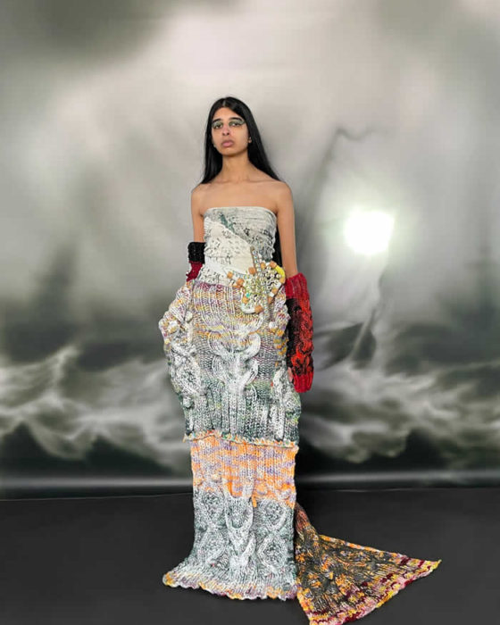 The smeary, glitchy psychedelic color effects that work their way through Matty Bovan’s fall video are a digital analogy for the vigorous free-form way that he’s always scrambled color, pattern, paint, and garments as if they’re materials on an artist’s palette.